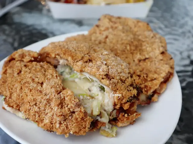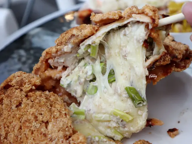 非常大器的起司量造成的牽絲瀑布,不手軟地放入三星蔥段,其間還有來自南方澳的鮪魚塊,這一大口咬下產生的豐富口感,是未曾有過的雞排經驗啊!有如法式料理般的奶香味及蔥香、魚香充斥口腔之中,好厲害啊!