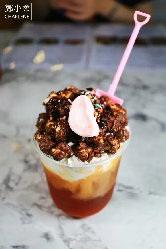 飲品最底層是現泡紅茶,中間為香甜的鮮奶油,上層是巧克力爆米花,