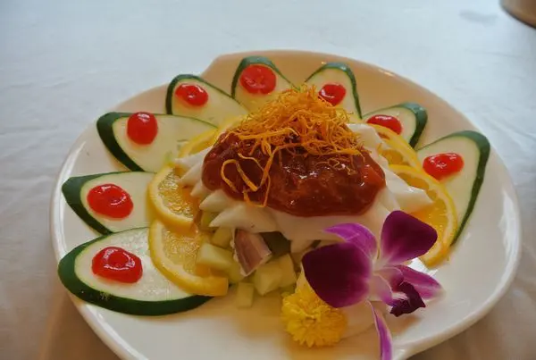 大黃瓜切片、柳丁、菊花、哈密瓜/蘋果切丁鋪底