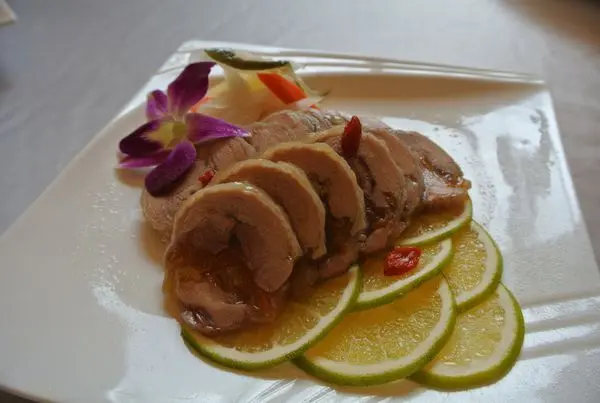 冰鎮醉雞腿肉捲著宜蘭名產金棗,相當有趣