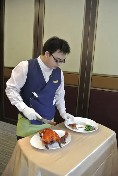 負責片雞的師傅會在桌邊展示片雞過程,包括擺盤XD