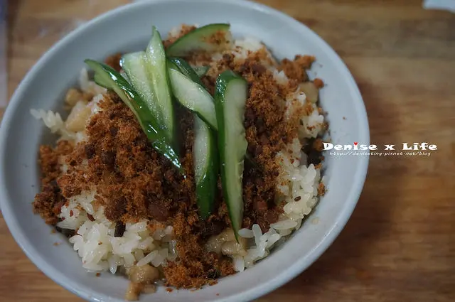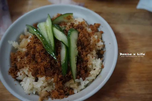 米糕飯淋上一勺肉燥汁及肉鬆 少許小黃瓜