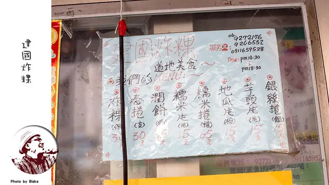建國炸粿菜單有一個小紙條,就讓你寫上那個炸物幾份而已,並沒有寫價格,要想知道價格,攤後有價目表可以參考,炸粿才賣30元,炸春捲也才賣30元,另外還有銀絲捲、芋頭跟地瓜等等,總類也算多,而且賣得並不會太貴,然後店裡面賣的潤餅跟春捲不太一樣,潤餅就是一般我們熟知的那種,就是沒有炸過單純用潤餅皮包,而春捲則是用潤餅包高麗菜後去炸。