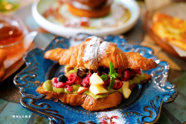 忘記這道甜品是什麼名稱了,看了一下菜單也沒找到,是水果搭配抹茶奶醬風味可頌,可頌很香脆
