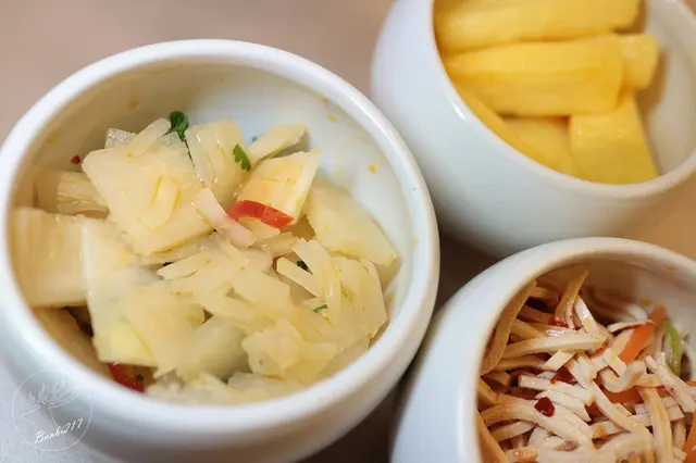 提供的三樣小菜:涼拌蕪菁(大頭菜)、涼拌百香果山藥、涼拌干絲。