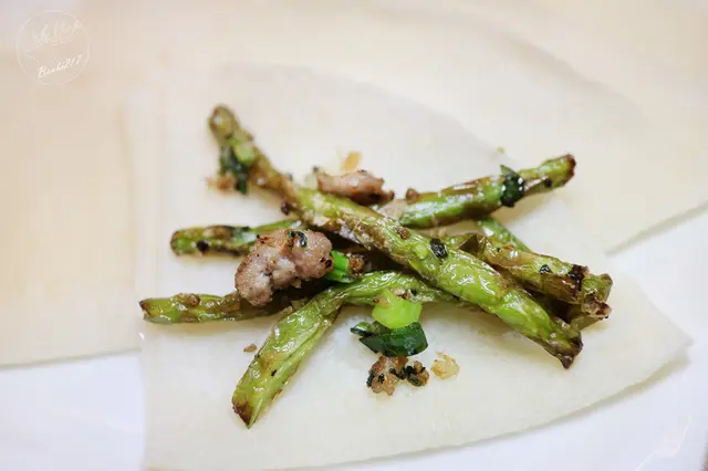 沒想到長榮鳳凰酒店的竹芬廳將乾煸四季豆與潤餅結合而成為一菜兩吃的吃法,將四季豆與豬肉末包入有點Q度與嚼勁的潤餅內品嚐,除了感到較不油膩外也別有一番特色。