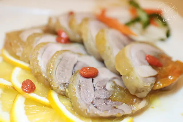 將宜蘭的金棗包入醉雞內,醉雞肉嫩有著迷人的紹興酒香,因與金棗醃漬更多點香甜的口感,酒香與微酸甜的味道十分開胃。