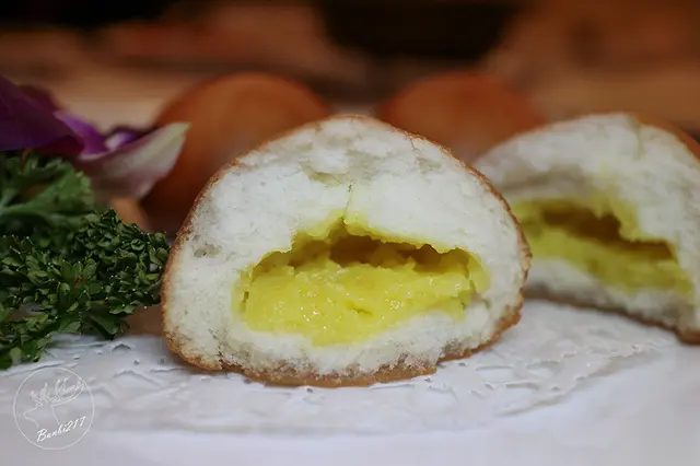 扒開包子炸至酥脆的外皮,裡面是鬆軟的包子體以及用豆沙及奶製成的甜豆沙奶黃餡,口感外脆內軟。