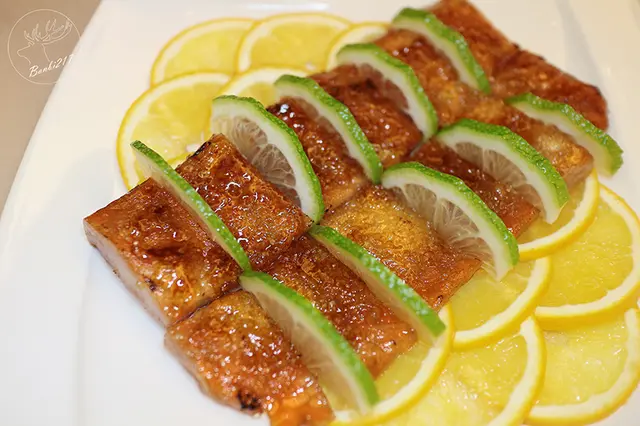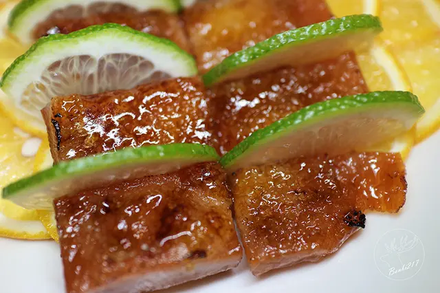將醃漬過的松阪豬肉,上頭撒以糖粒在烤至焦糖化,最外層是薄脆的焦糖外皮,而下層的松阪豬肉Q嫩帶些甜味,整道菜十分特別,搭配檸檬或柳橙切片吃則更能解膩。