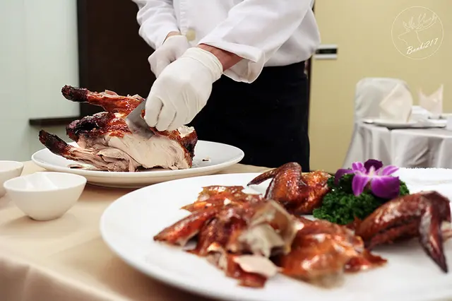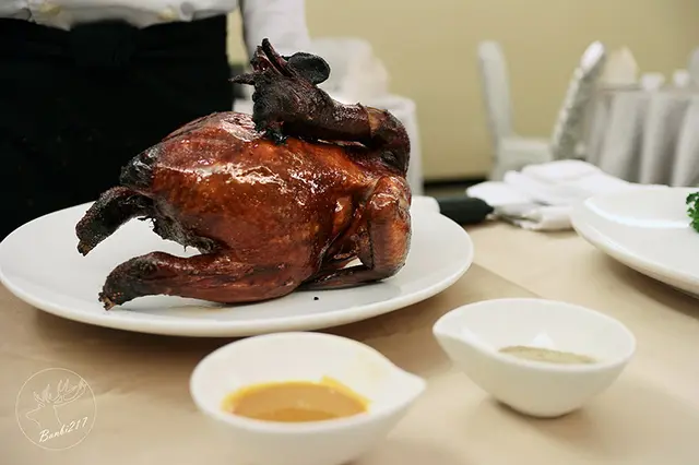師傅推著放置「蒜香當紅炸子雞」的推車前往竹芬廳,在親切的服務員的專業解說下,師傅也在我們捉為旁進行桌邊服務現片雞肉。特別要提到的是,在推進來的時候,那蒜香充斥著整個餐廳,且在進行片肉時,那酥脆的卡滋聲真叫人恨不得立即吃到。