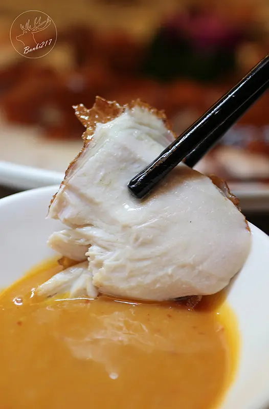 片好的雞肉除了可以直接品嚐原味外,也可選擇沾上胡椒鹽又或是香甜帶些微辣的豆乳醬。