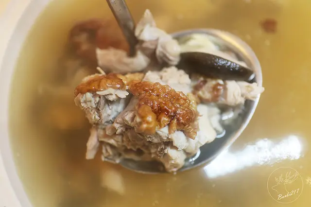 將雞肉與雞骨加入大蒜、香菇熬成的蒜頭香菇雞湯,湯散發濃郁的香氣,喝起來更是溫潤順口。