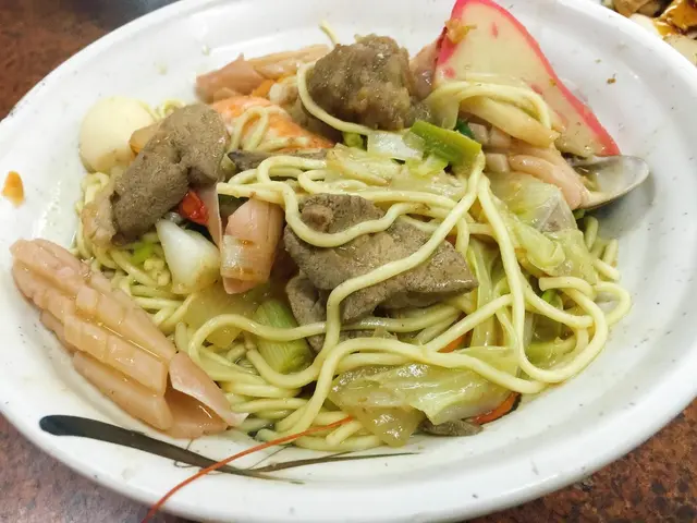 豬肝、魷魚片、魚板、蝦子,吃起來就是很台式的炒麵,