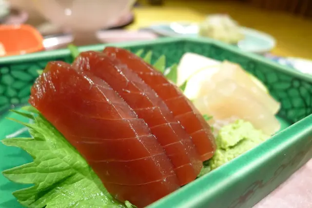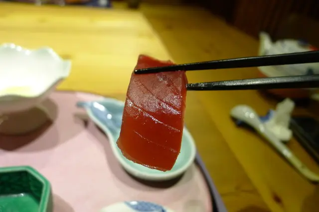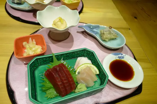 他有3種生魚片 鮪魚 旗魚 另一種應該是紅魽吧 生魚片很好吃 吃的時候再跟紫蘇一起入喉 紫蘇特殊的香氣讓生魚片的味道更好 也有殺菌的效果