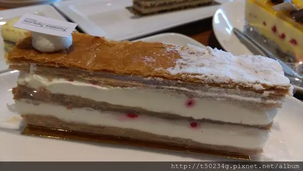還有另一款開心果覆盆子千層酥,中間的莓果跟克林姆搭配得很好,只是這種千層酥一切就散食用上真的不太方便。
