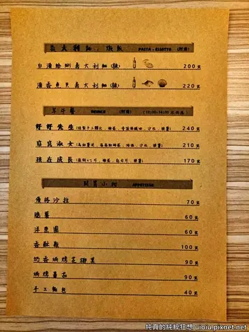 好喝的郁離子咖啡不只做自家烘焙咖啡也開店面了!早在接觸他們的咖啡時就知道對品質有多麼要求,現在他們把這種精神帶進店裡,初幕除了咖啡喝了不心悸外,義大利麵、燉飯,其他餐點都堅持無添加,呼喚味蕾對食物最原始的記憶,也許剛開始吃不習慣,但這才是食物該呈現的本味呀! 初幕,位在竹北光明三路上,靠近光明一路美食商圈,附近不好停車,建議停到家樂福對面停車場或是竹筍公園停車場,走路過來不過五分鐘,算是挺方便的,在門口就提供菜單讓你翻閱,覺得不錯就可以入內用餐,不收服務費餐點(主餐)又附湯品,感覺很貼心呢!推門而入可以看見店內有許多可愛溫馨的佈置,每個角落都很好拍照,就連候位區也簡單樸實可愛! 店內的座位不多,但感覺不擁擠,用餐時不會被打擾到,坐起來也很舒適, 洋蔥圈 60元 洋蔥是很奇妙的蔬菜,生吃很嗆,但煮熟後又只會散發出甜甜的洋蔥味,炸洋蔥圈就是吃酥脆的外表及幾乎作到化掉的洋蔥,我自己是蠻喜歡這道炸物,沒想到小惡魔也喜歡,吃的津津有味的,一口接一口。 焗烤蕃茄 90元 焗烤就是充滿濃濃的起司呀!初幕的起士給的好大方,而且感覺用的是不錯的起司,拉起來這~~麼長!到是沒想到只有蕃茄加上焗烤還蠻好吃的耶,真的是很異國風情的開胃小菜,份量不多,但濃濃的起司香成功的勾起食慾,好想趕快吃下一道菜!手工麵包 40元手工麵包每天推出的味道都不一樣,看老闆娘今天想烤哪種麵包..XD,這一道是為小惡魔點的,一般的麵包吃多會脹氣,但手工麵包用料實在比較不用擔心,可以放心給小朋友吃,建議趁熱吃口感會比較柔軟,放涼後因為無添加,我覺得麵包會偏硬一些哦! 商業午餐 168元起 (依當日店家公告為主)商業午餐及主餐類都會附上今日例湯,每天的味道都會公告在黑板上雖然是附湯,但一點也不馬虎,本來今天的例湯是南瓜牛奶蔬菜湯,但餐點賣太好已完售,所以換上蕃茄蔬菜湯,看來濃郁但喝起來其實蠻清爽的,主要都是蔬菜熬煮出來鮮甜的湯頭,真的很建議喝光光,補充一日所需青菜! 初幕為了讓多人可以用實惠的價格吃到初幕的好料理,所以近期要推出商業午餐囉!品質不打折,但讓你用更少的COCO可以品嚐到食材的本味,這道清炒蛤蜊義大利麵蛤蜊給的也不少,而且蛤蜊本身很新鮮哦!而義大利麵只利用蛤蜊本身的鹹度為底讓麵體吸收湯汁,非常的爽口清淡,因為現在小惡魔要吃的清淡,我自己也開始改變飲食習慣,味道上我覺得還不錯,吃的到食材最原始的滋味,但習慣重口味的周先生就吃不慣了,直呼少一味!(就是少了重口味調味料啦!XD)蕃茄紅了漁夫義大利麵 240元 初幕的義大利麵是偏硬的口感,吃的到麵芯,咬起來勁道十足,醬汁很好的吸附在麵條上,覺得有入味, 漁夫麵也有人叫它什錦海鮮麵,就是捕魚人家用當日漁獲煮出來的麵!初幕的漁夫麵有滿滿的海鮮,蛤蜊、蝦子、花枝在裡頭,還有營養均衡的花椰菜、玉米筍、紅蘿蔔,其實我現在在外面很少點海鮮系列的餐點了,因為真的很多都不新鮮,吃到直皺眉頭,不過初幕的海鮮都是老闆特別早起去挑選過的,吃起來有"青"!滿滿的一盤海鮮感覺超值!本來以為偏硬的義大利麵小惡魔會不喜歡,但卻意外的一口接一口的吃下去,看來初幕的義大利麵有對他的胃!▲小惡魔說:這杯果汁是我的!新鮮現打季節水果汁 100元這一杯超大杯的現打果汁才100元,感覺好划算,水果以當天有的為主,可以詢問店家,這一天的是奇異果汁,雖然大杯喝起來也很濃郁,感覺店家用料很大方耶!果汁不加糖,但會加少許蜂蜜調整味道,讓果汁喝來不刮嘴,本要就是奇異果微酸微甜的原味,好適合給小朋友喝!限品手沖咖啡 (價錢請詢問店員) 還記得以前最愛的就是加奶的拿鐵了!但自從接觸到手沖咖啡後,才知道原來咖啡喝手沖單品才能真正體會咖啡苦澀中回甘的滋味,手沖咖啡可以讓咖啡豆的原味完整呈現,而好的手沖咖啡可以呈現出咖啡的前中後味,而且好的咖啡豆喝了不心悸,初幕的豆子就是這種喝了不會心悸的好咖啡豆哦! 初幕的手沖咖啡有一般常見的曼特寧、特殊檸檬香氣的耶加雪菲,還有這種限定手沖咖啡,因為量不多,每天的種類可能都不同,每一杯手沖咖啡都特別附上了咖啡粉可以先聞看看咖啡乾粉時的香氣,手沖後的咖啡味道又有所不同哦!而且初幕的手沖咖啡熱熱喝好喝,放涼了喝也不會喝到酸味,這一天喝到的就是帶有焦糖香氣的手沖咖啡,一開始會有些苦澀但越喝越順口,喝的出回甘的滋味,初幕手沖咖啡的份量也比一般店家多出許多,但一整壺喝下去都沒有任何不適哦! 附帶一提,初幕用的是雙層隔熱杯,所以喝熱飲完全不用擔心會燙手哦!玫瑰拿鐵(400cc) 160元如果還是喝不慣黑咖啡,也很推薦品嚐初幕的拿鐵哦!這款玫瑰拿鐵還多了玫瑰果露,喝起來很特別呢!不過不要像我一樣攪拌不完全,不小心先把甜甜的玫瑰果露喝完就變成原味拿鐵啦!XD不過原味拿鐵才是我的本命呀!初幕的拿鐵不用說也一樣好喝!一杯好的拿鐵應該是喝的到奶香也喝的到咖啡香,比例得宜不會有誰搶了誰的風采,相得益彰,重點是喝完一壺手沖咖啡後我又把拿鐵喝完也不會不舒服耶!附上菜單: 查看更多