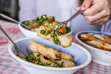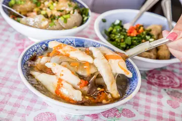 苗栗美食湯家大肉圓可是當地赫赫有名的肉圓店,已經有七十年的歷史,有別於一般的肉圓,湯家大肉圓是先煮後炸,然後肉圓尺寸可是一般肉圓的兩倍大,還有苗栗國特有的『熱狗』,便宜又大份量,不管平假日生意都超好的湯家大肉圓|交通方式&停車資訊湯家大肉圓位於苗栗市中山路上,畢竟已經是七十年老店了,店面充滿懷舊感,路邊有停車格,我們來的時候是下午三點,門口還是很多人在排隊,湯家大肉圓有兩個店面,感覺是在地人外帶的比較多,內用的人反而少攤位前阿姨正在炸肉圓,幾乎是炸沒停的,這裡的肉圓是先用水煮過放涼,再丟到油鍋裡炸,炸鍋裡是滿滿的肉圓,仔細看這裡的肉圓真的超大一顆,大概跟一顆壘球差不多大,炸好的大肉圓擠掉油後,上桌前會淋上滿滿的客家韭菜醬料,建議加辣更好吃!肉羹也是這裡的主打,肉羹、配料都很多,整碗裝滿滿的湯家大肉圓|菜單價目表湯家大肉圓夏天還有賣剉冰,但好像都沒人買,大家多數是肉圓+肉羹湯,另外還有苗栗熱狗,價位都超便宜的,一百元就可以吃很飽湯家大肉圓|肉丸、肉羹、熱狗招牌一次全點了,肉丸、肉羹、熱狗這樣才$105,有夠便宜啦!肉圓,上面滿滿的客家韭菜醬,真的跟一般看到的肉圓不大一樣,肉圓皮很厚但很Q彈,有點像在吃水晶餃,而且不會油膩,內餡有別於以往吃到的碎肉,裡面是一塊塊完整的豬肉還有很多小筍塊,加上香氣十足韭菜跟辣椒,很好吃ㄟ,而且它超大一顆,吃完會飽熱狗,明明是黑輪啊,說法很多,有一說是早年因物資缺乏,所以會用剩餘的魚漿和蔬果碎末混在一起做成形狀類似熱狗的黑輪,也有一說是幾十年前,苗栗當地小吃店老闆刻意將「魚捲」叫成「熱狗」,因為比較好賣,後來就一直延續這名稱,久而久之黑輪在苗栗就變成熱狗了(實在很好奇真的熱狗是叫熱狗嗎?)苗栗熱狗也是加上跟肉圓一樣的韭菜醬,然後本體就是我們很熟悉的炸黑輪,QQ軟軟的,魚漿香氣頗鮮甜肉羹,這應該是我吃過最濃的肉羹,勾芡程度大概已經是麵糊頂級,勾這麼濃還不會結塊也是厲害,肉羹也是自家做的,鮮味很夠且很嫩軟,一碗$35元給這麼多,沒什麼好嫌雖然我很愛吃彰化肉圓,但湯家大肉圓這種特別形式的肉圓我也很喜歡ㄟ,尤其那個皮的Q度完全不會輸給彰化肉圓,而且韭菜醬也讓整體肉圓味道更豐富,真的是出乎我意料的好吃R~ …查看更多