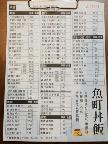「魚町丼飯」開在南大路時就曾注意它沒多久後看到東大路也開一家分店網路上不少食記在介紹它們家的丼飯看起來料多又不會太貴東大店離家近多了預計著有機會就要來魚町吃丼飯東大路上的「魚町丼飯」附近不太好停車門前與巷內大多是畫紅線除非要碰碰運氣看遠一些有沒有路邊停車格晚上五點半不到店裡竟已滿位店面不大間加上座位數少只好在外面與寒風相伴等位子虧我這天還出奇早來吃晚餐╮(╯_╰)╭日本料理不可或缺的生魚片丼飯選擇就有二十多種價位多落在一百五到二百八區間燒烤/手卷/沙拉/小菜炸物握壽司/軍艦壽司/卷壽司餐點內容不另收服務費且有味噌湯及茶水可自取看得出味噌湯是用鮭魚骨下去熬魚町生魚片丼 NT.220通常貫上自家店名的菜色皆為招牌料理不用考慮先來一份除了各式新鮮生魚外週邊附的日式小菜為色彩加了不少分用餐時發現座位上方設計了投射燈讓每道送上桌的食物都閃閃動人散發著可口的光芒我喜歡生魚丼飯裡多樣化的海鮮每一口都能感受不同的味蕾有甜蝦有生魚又有嗶嗶波波真是豐富起司可樂餅 NT.90擺盤很用心但如果我是廚師應該不會想將這道料理送到客人桌上第一次看過皮膚這麼黝黑的可樂餅幫大家翻找一下起司在哪裡揚出豆腐 NT.80照片中看不出豆腐的大小應該要放個比例尺真失策深烤海魷魚丼 NT.220幸好今日點的丼飯都很夠水準整隻香烤魷魚霸氣上桌一圈圈肥美的鮮魷和菜單中的照片無落差果然來「魚町丼飯」就是要點丼飯下次不敢再嘗試亂點其他配菜店家沒有提供訂位以及外帶服務一切只能在現場候位這天坐的位子不佳在櫃台正前方一直被店家站在旁邊盯著用餐壓力好大希望下次不要坐到同一個位子不然換去南大店吃吃看好了❖ 魚町丼飯地址:新竹市東大路二段170號電話:03-531-9650時間:11:00~14:00 17:00~21:00(週一休) 創作者介紹 棉花糖布丁 Pudding's Life查看更多