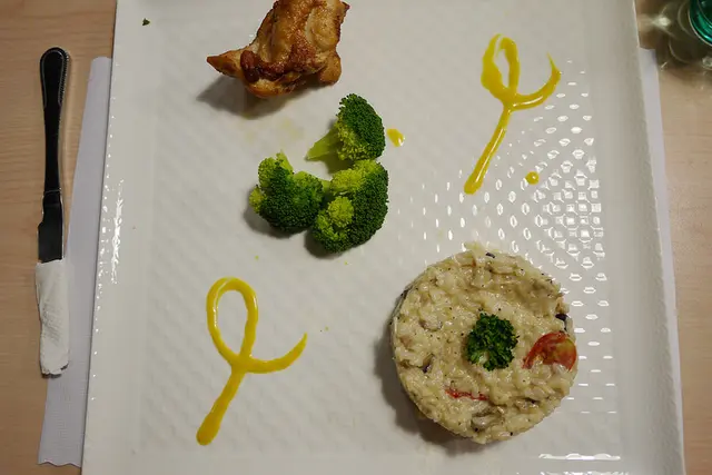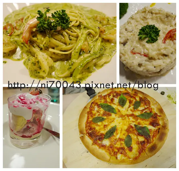 我跟老公分別點了青醬蝦仁蘆筍細扁麵奶油蘑菇香草雞胸燉飯加點一份套餐