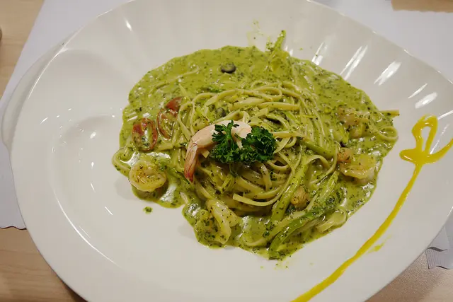蝦子和蘆筍、麵條,都被濃濃的青醬包圍了