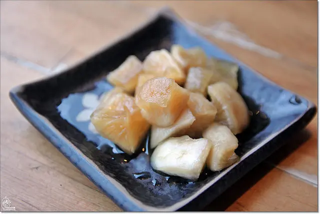除了奉上熱茶還會請你吃客家小菜『醃菜脯』,是懷念的滋味,改良過後的菜脯不死鹹,有點酸甜與鹹香呢!