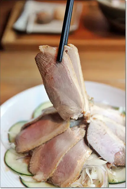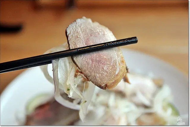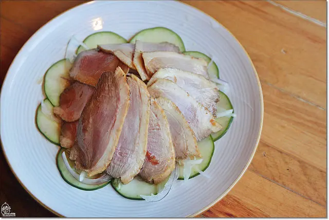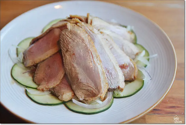 來自宜蘭三星鄉無污染養殖的櫻桃鴨,因為肉質軟嫩紮實又Q彈飽滿多汁,所以這幾年簡直就是餐廳的新寵,只要歐法料理還是精緻高價一點的餐廳幾乎都是使用來自宜蘭的櫻桃鴨。 吃起來真的跟一般鴨肉不太一樣,軟嫩中帶著Q彈與紮實的口感,飽滿的肉質還有鮮甜的肉汁更是讓人齒頰留香。其實櫻桃鴨不需要太過調味烹飪,只要簡單的煮熟切盤加上生洋蔥與和風醬就很爽口美味了,比較偏日式和風的料理方式!
