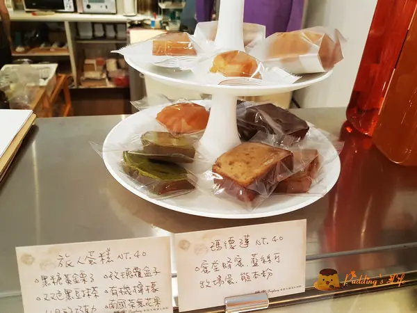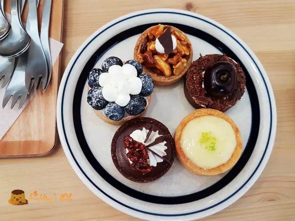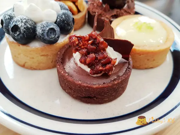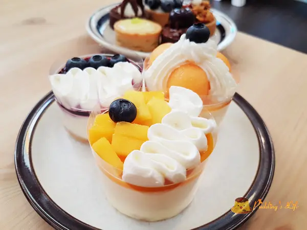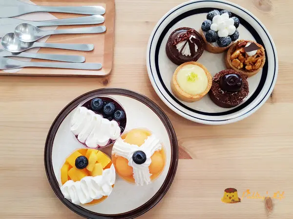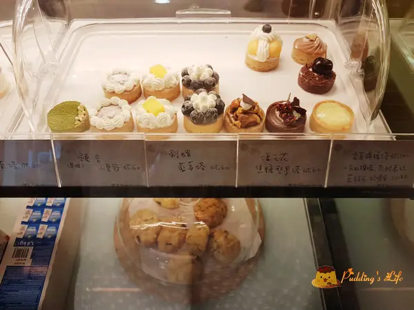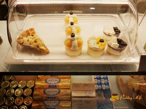 甜點櫃裡有司康.塔類與乳酪慕斯等