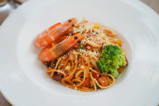 誰會預設海鮮茄汁義大利麵是辣口味啊!與其說是海鮮,其實就是兩隻蝦子而已