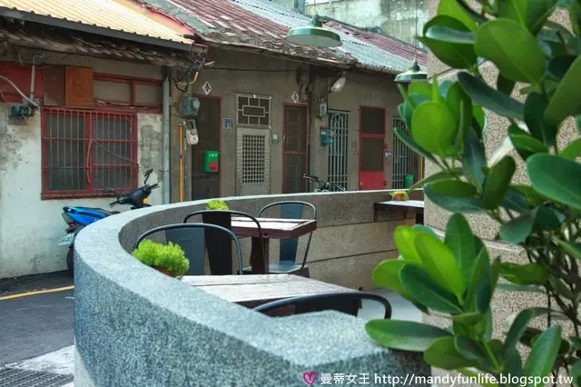 門口的左邊圍繞邊間延伸出半弧形的戶外用餐區,旁邊則是小有歷史的民宅矮房,凸顯出一種很特殊的小眷村氣氛!
