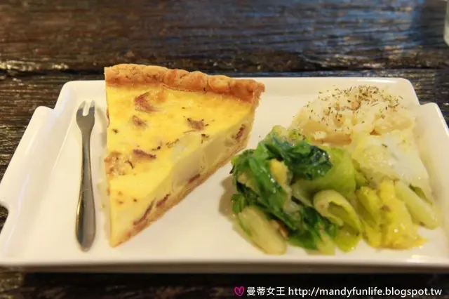 「培根洋芋鹹派」,鹹派的內餡是以蛋再和入扎實的餡料製成,吃起來鹹香,派皮也很酥脆,好吃!邊盤搭配少許洋芋泥和油醋醃製過的蘿美生菜,整體品嚐起來還算清爽。