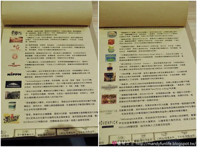 翻開菜單的第一頁,寫著店內使用的各項食材的來源,將像是麵包、麵粉、雞蛋、雞肉、生菜、優格、茶...等原料的來源供應商都透明化,看起來都是很優質嚴選的供應商。