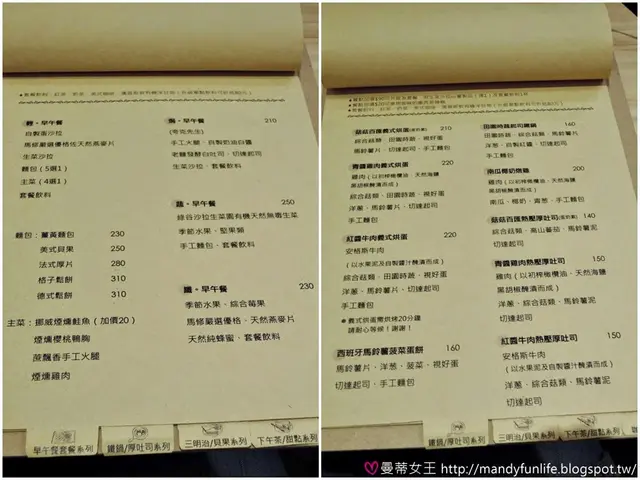早午餐類 (附飲料) 的選擇很豐富,麵包和主菜肉類都可以自行任意搭配,隨著不同的麵包和主菜選擇,套餐的價格也不太一樣。右手邊的菜單是店家特色的義式烘蛋和熱壓厚吐司系列,都有多種口味可以選擇。