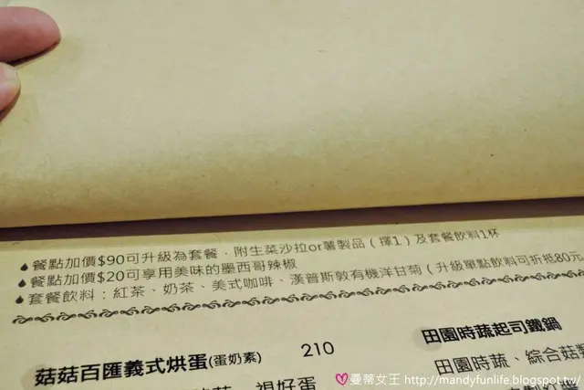 義式烘蛋和熱壓厚吐司類可加價$90升級為套餐,另外還提供加價的墨西哥辣椒可搭配餐點一起享用。