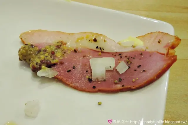 櫻桃鴨胸片成薄片,再搭配法式芥末籽醬和一點洋蔥碎,好吃且口味很精緻。