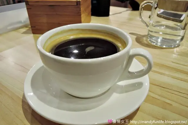 附餐「美式熱咖啡」,咖啡品嚐起來比較偏苦,平常喝淺烘豆居多,就不是很喜歡它的口味囉~
