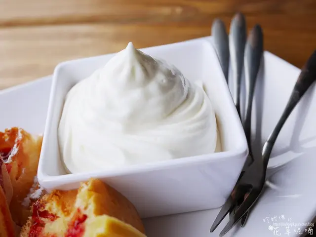 草莓鬆餅淋了滿滿的草莓果醬,旁邊有附一份奶油
