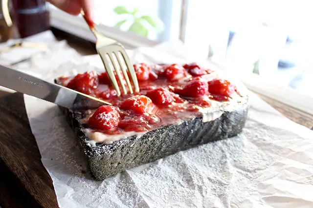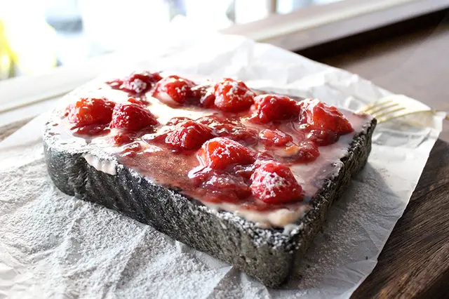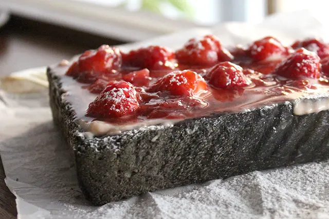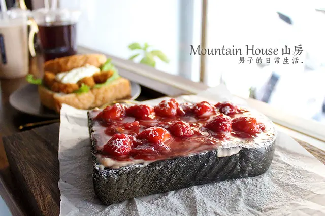 竹炭山形土司抹上滿滿的乳酪、草莓果醬,
