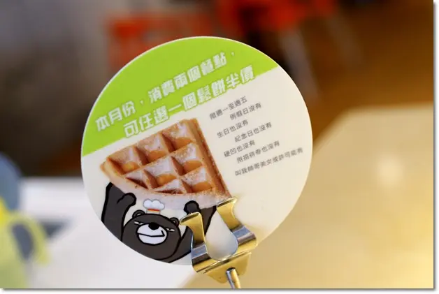額外提一下,每個月都有優惠活動,這次是:消費兩個餐點,可任選一個鬆餅半價 (限週一至週五,例假日沒有)
