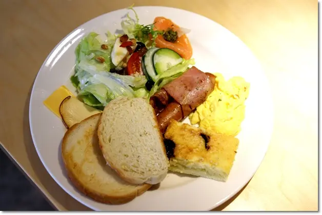 挪威全日早餐 NT$180:這一盤裡有:吐司、燻鮭魚、沙拉、起士、德式香腸、炒蛋、私家蛋糕,另外還附一杯飲料。飲料可選:冰飲-美式咖啡、綠茶、紅茶、蔬果汁、奶茶 / 熱飲-美式咖啡、伯爵紅茶、奶茶;若不想喝附餐飲料,亦可更改其它飲品折價$30,但我覺得附的飲料喝起來還不錯,不用換也ok。