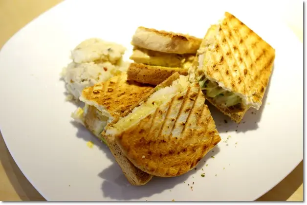 起士雞烙吐司(熱三明治) NT$120:我承認一開始有點貪圖它價格不貴,所以才選擇它~不過吃了之後發現C/P值還蠻高的耶。切成四小塊的方型起士雞烙吐司,配上一球薯泥,視覺上是有點空虛...但吃完還是頗有飽足感的。