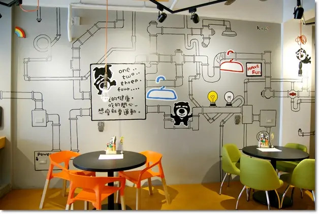 用餐當日因為是平日再加上我們是當天2F的第一組客人,所以趕緊抓緊時間拍下場空的畫面;牆上滿滿的黑熊趣味塗鴨,真的很適合帶小朋友來用餐,因為光看著牆壁他們就可以High半天嚕。