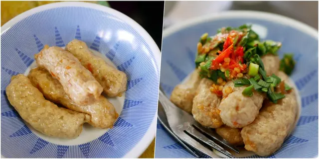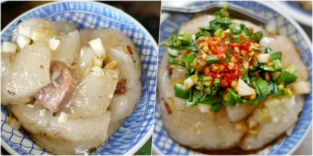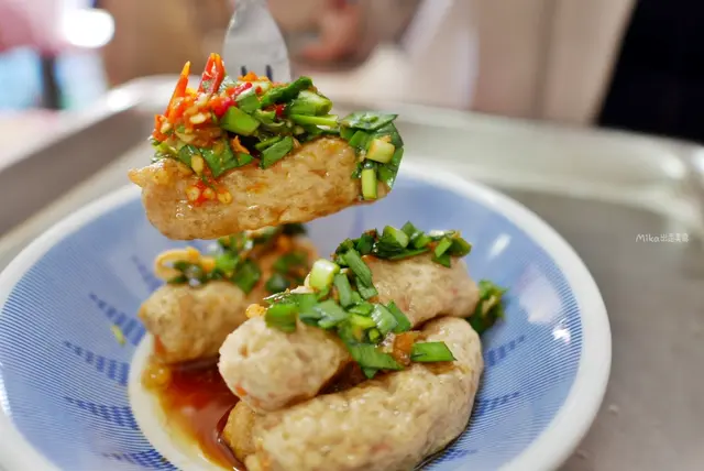 這裡的肉圓都是水煮後放涼再去低溫油炸,炸好的大肉圓擠掉油後,上桌前會淋上滿滿的客家韭菜醬油,想吃辣的可以+店家自製辣椒。