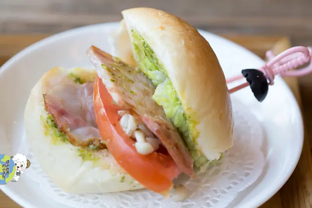 今日獨家是青醬野菇里肌肉時蔬三明治、美生菜、蕃茄片,