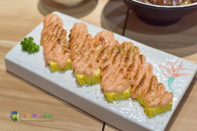 口感濕潤的玉子燒融合著明太子美乃滋的柔滑甜香,表面還有用噴槍炙燒處理,品嚐時多了股微微的炙燒香。