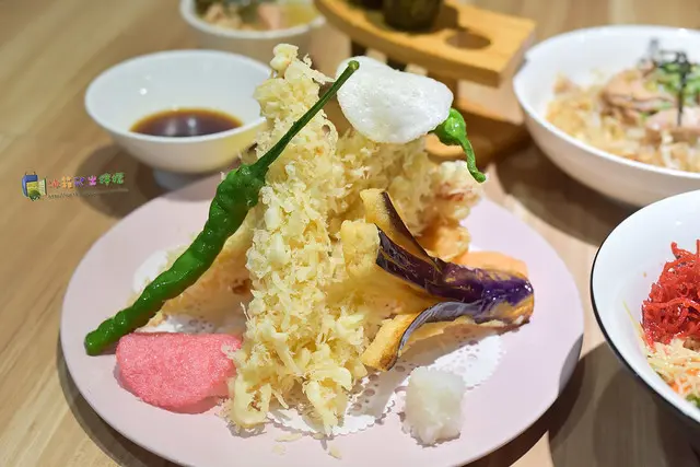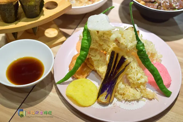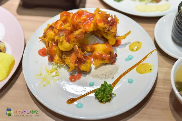 這份炸蝦天份羅給的未免太有誠意了吧!!旁邊還有炸茄子、青龍椒、地瓜和喜宴用的彩虹蝦餅做陪襯,可說是一份炸蝦多重享受