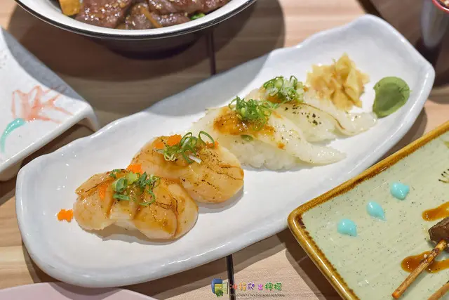 炙燒干貝握壽司-干貝口感軟嫩鮮甜,咀嚼時還帶著醬香和炙燒香氣,搭上微微的芥末嗆辣,真的很好吃