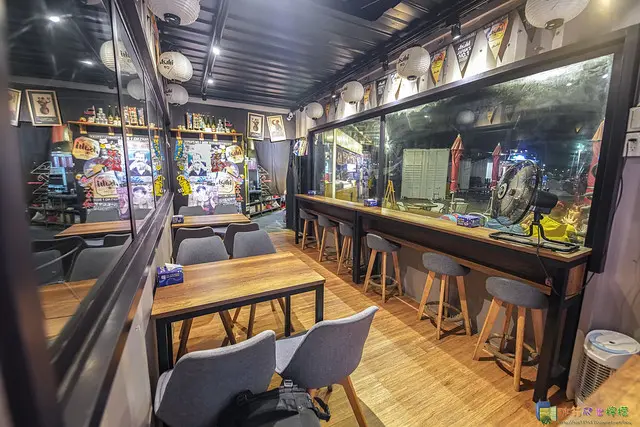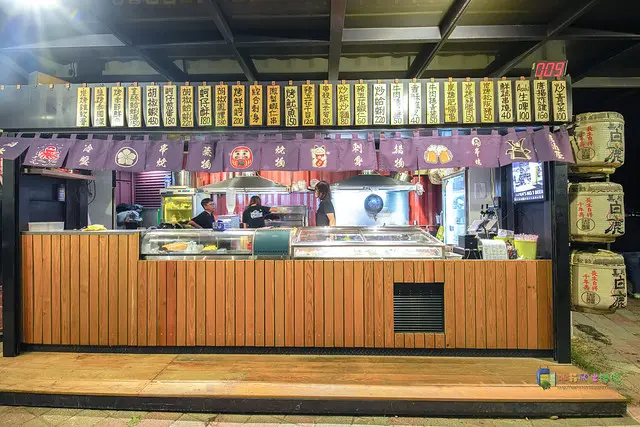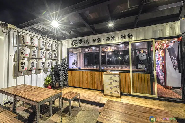 ▲品串燒正是位於貨櫃市集裡頭,在198咖啡車的後方,店家外觀上有用日式旗幟、燈籠和大大的白鹿草包清酒做裝飾,看起來頗有日式風味。