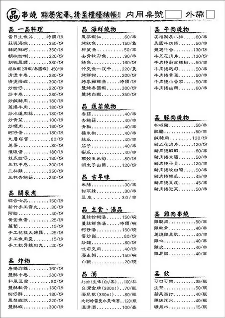 每到傍晚時分,醉人的炙烤香氣飄散,饕客們紛紛聞香而來,【品串燒】靠著師傅嫻熟的手藝,烤出一串串誘人美味的串燒,除此之外,店內還提供炸物、熱炒、關東煮、海產粥....等多樣化餐點。