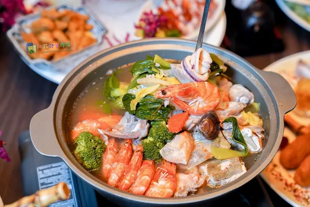 這一鍋的配料超級豐盛,裏頭有蝦子、鮭魚頭、蛤蜊、透抽、高麗菜、青花菜...等,湯頭剛入口的時候會喝到淡淡的柚子清香,但煮久之後,湯頭的鮭魚香氣會超級濃郁,加上其餘海鮮配料和蔬菜的甘甜味,喝起來濃郁鮮香、甘美順喉