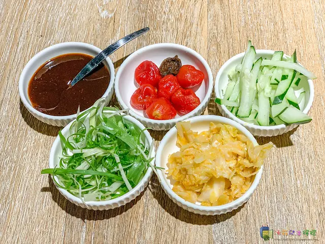 ▲烤鴨上桌前會先附上甜麵醬、蔥絲、黃瓜絲、黃金泡菜、梅漬番茄。